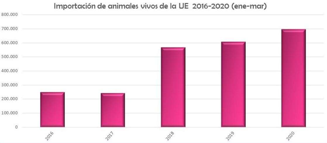 - Importaciones de animales: Las importaciones de animales procedentes de Europa en el periodo de enero – marzo de 2020 respecto al año 2019 aumentaron un +14,6%, mientras que respecto a la media de los 4 años anteriores aumentaron un +67,40%.