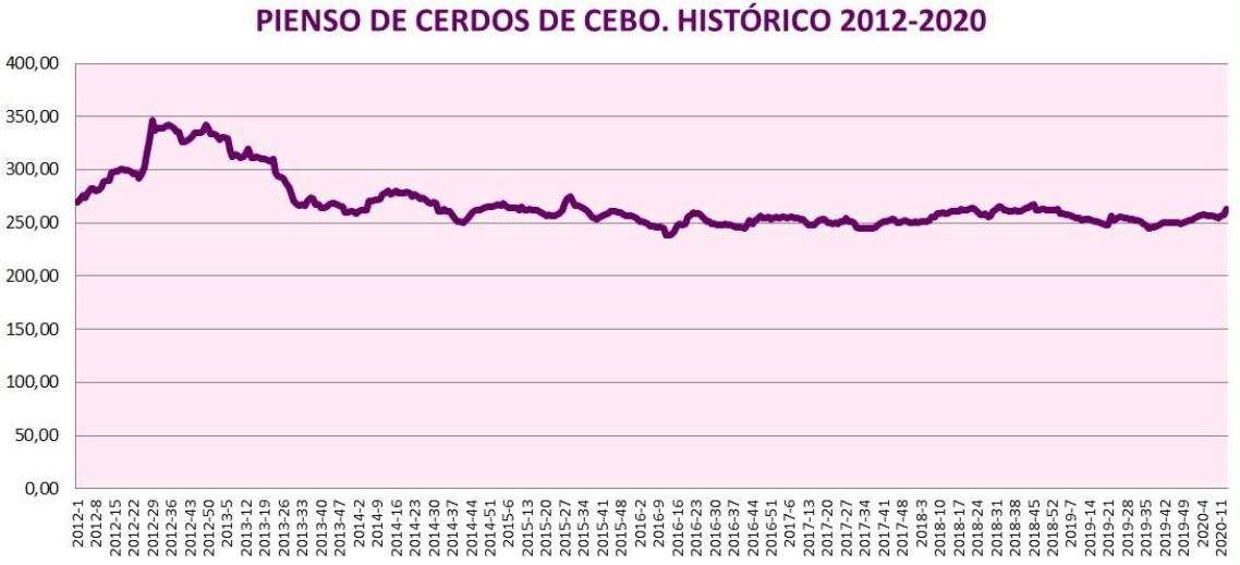 - Precio del pienso cebo: La media en lo que corresponde a 2020 se establece en 257€/tn, mientras la semana 13 del ejercicio 2020 presenta un precio de 263,47€/tn. La media del periodo 2012-2019 se establece en 268,15€/tn.