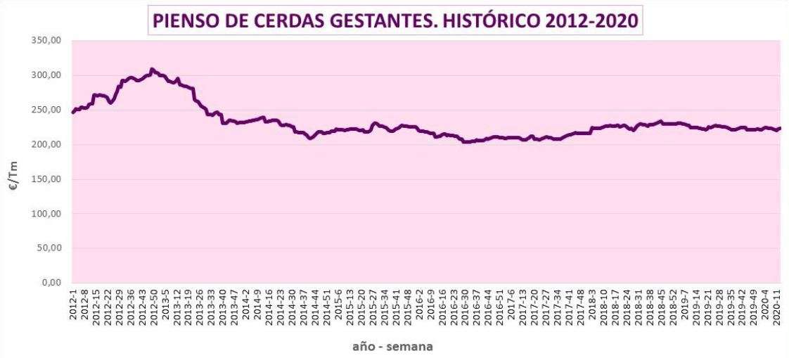 - Precio del pienso gestantes: En la semana 13 del ejercicio 2020 presenta un precio de 223,32€/tn, siendo 222,90€/tn la media de lo que corresponde a 2020. La media del periodo 2012-2019 se establece en 233,15€/tn.