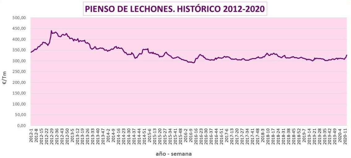 - Precio del pienso lechones: En la semana 13 del ejercicio 2020 presenta un precio de 326,68€/tn, siendo 312,52€/tn la media de lo que corresponde de 2020. La media del periodo 2012-2019 se establece en 336,23€/tn.