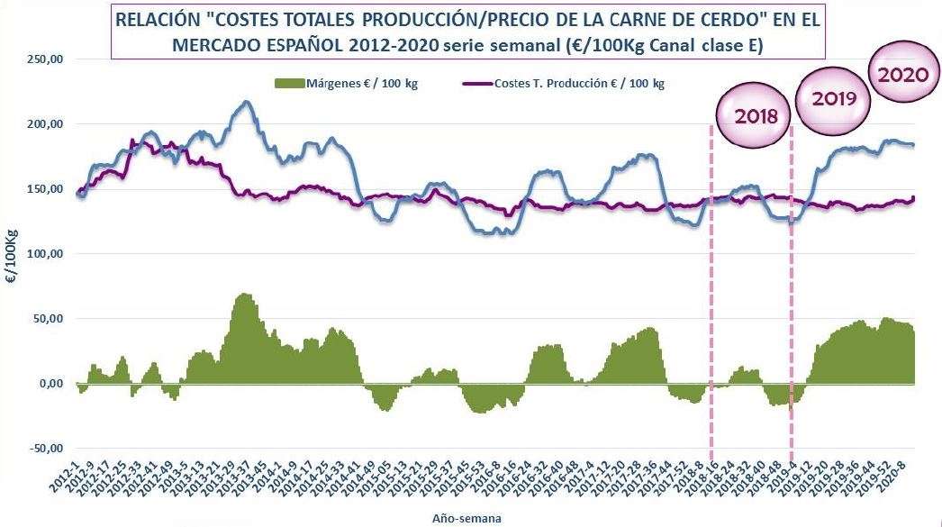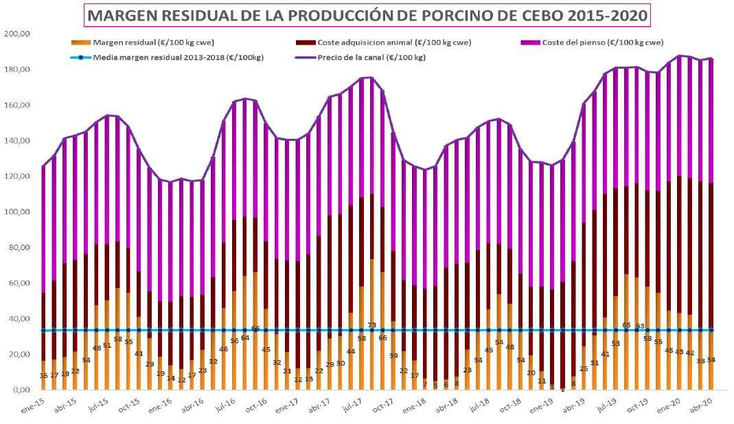 - Margen Residual cebo: Presenta una media para el perido de 2015-2020 de +33,70€/100kg.