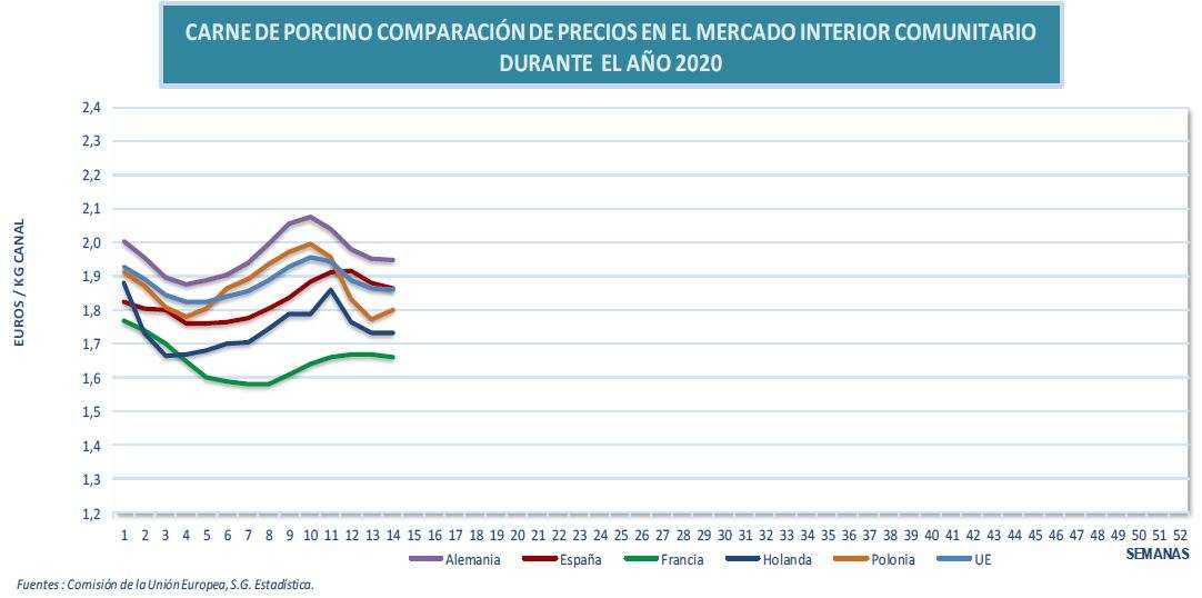 - Precio comunitario de carne de porcino en canal E: Establecido el precio en 186,40€/100kg en la semana 13 de 2020, España presenta un precio inferior del -1,23% respecto a la media de la UE.