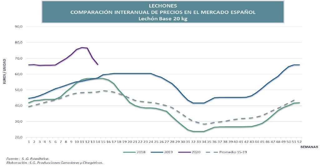 - Precio lechón base 20 kg: Evolución positiva respecto al trimestre anterior del +28,94%, y del +23,45% respecto a la semana 13 del ejercicio de 2019, presentando en la semana 13 del actual ejercicio un precio de 70,33€/lechón.