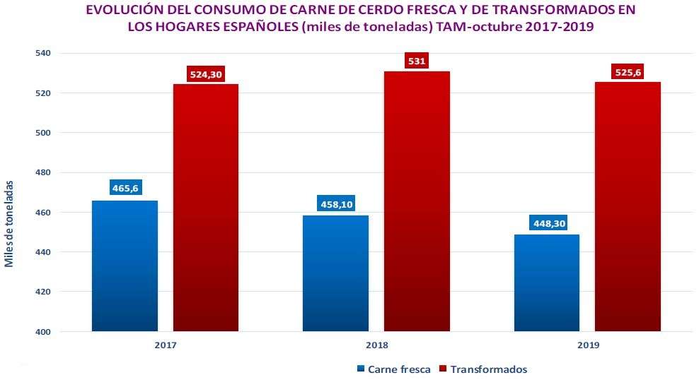 - Consumo de productos frescos y transformados: Establecido una media de consumo de transformados entre enero y octubre de 2019 de 11,46 kg/per cápita, y una media de consumo de carne fresca de porcino de 9,77 kg/per cápita, presentan respecto al periodo 2018 -2019 una variación negativa de -2,14% en la carne fresca, y en el caso de los transformados una variación de -1,02%.