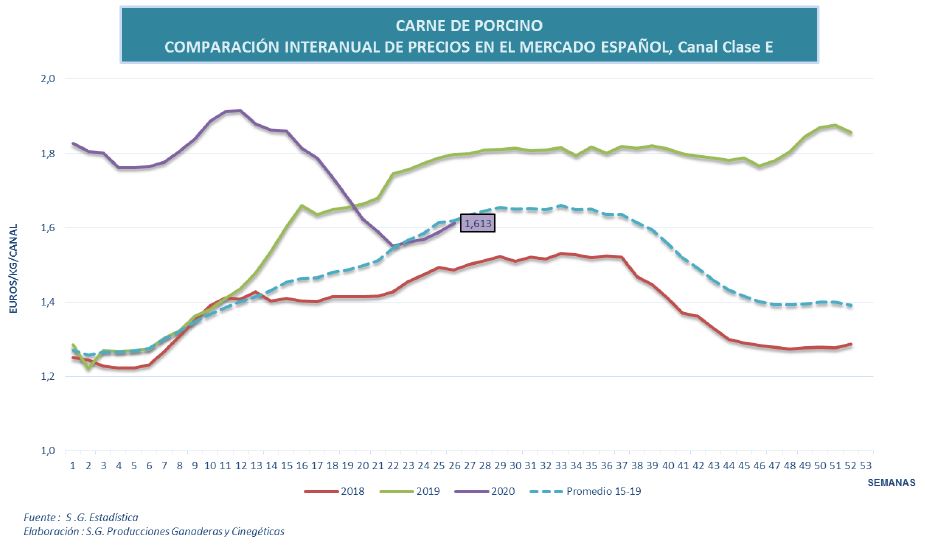 - Precio nacional de carne de porcino en canal E: Evolución negativa del -8% con respecto al trimestre anterior, y del -11,27% con respecto a la misma semana del ejercicio 2019, presentando en la semana 26 de 2020 un precio de 161,30€/100kg.