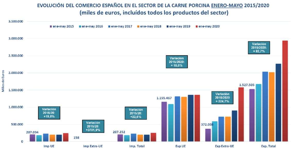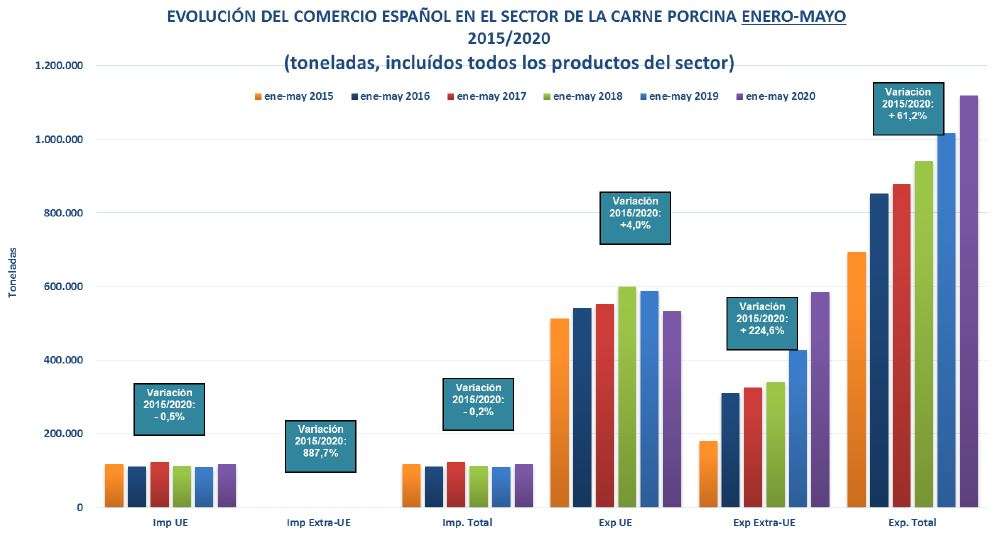 - Comercio exterior: Las exportaciones españolas extracomunitarias presenta una evolución en toneladas positiva del +224,60% en el periodo de 2015 – 2020, mientras que las exportaciones en general en el mismo periodo presentan una variación positiva del +10%. Respecto al valor de las exportaciones, durante el periodo de enero – mayo de 2014 – 2020, las exportaciones extracomunitarias aumentaron un +324,70%, y en el periodo de 2019 – 2020 aumentaron un +29,80%.