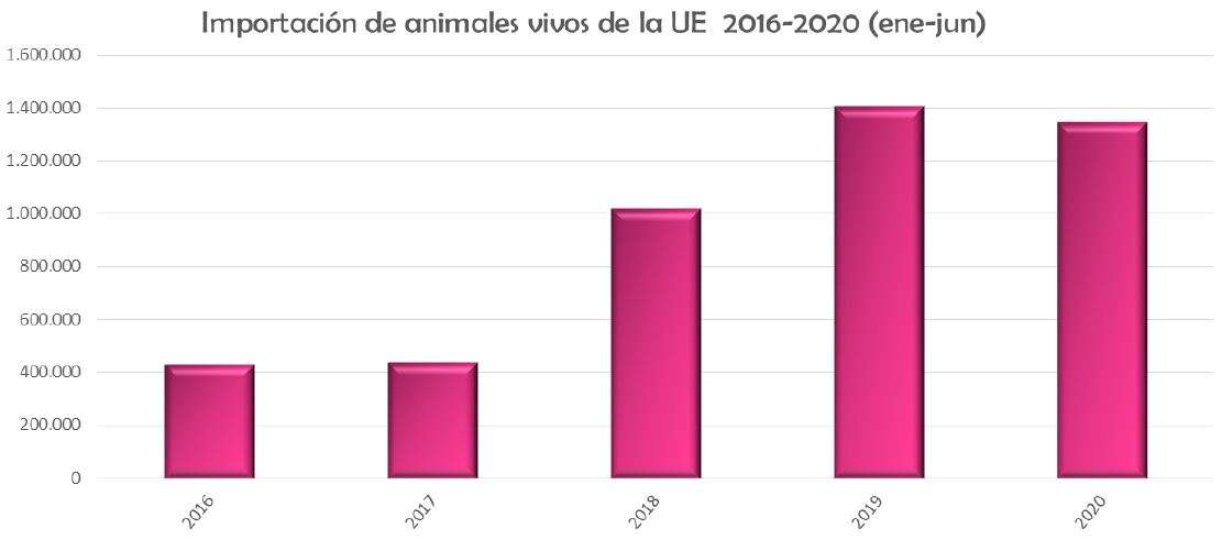 - Importaciones de animales: Las importaciones de animales procedentes de Europa en el periodo de enero – junio de 2020 respecto al mismo periodo del año 2019 se redujeron un -4,10%, mientras que respecto a la media de los 4 años anteriores aumentaron un +63,50%.