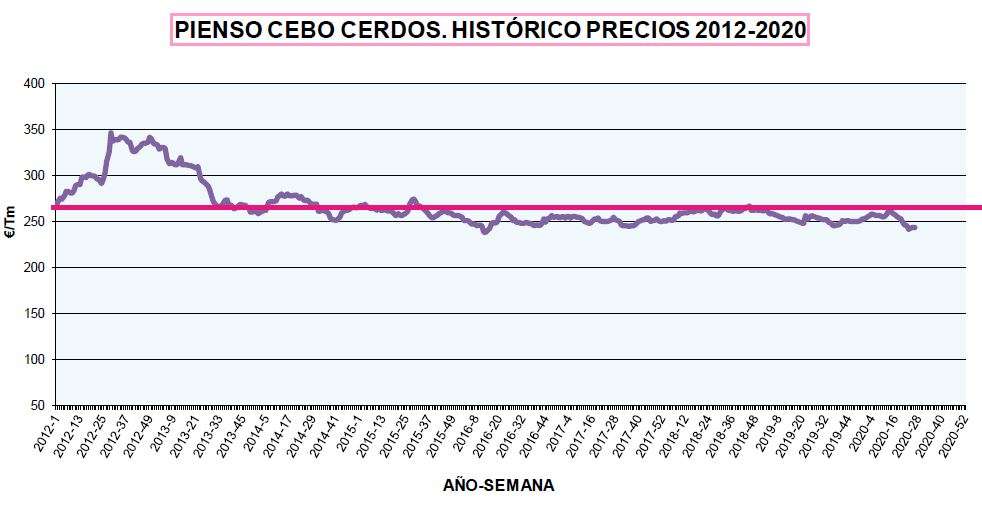 - Precio del pienso cebo: La media en lo que corresponde a 2020 se establece en 253,50€/tn, mientras la semana 26 del ejercicio 2020 presenta un precio de 243,30€/tn. La media del periodo 2012-2019 se establece en 266,55€/tn.