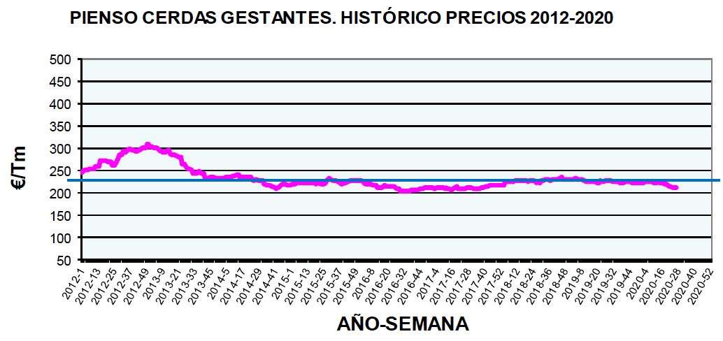 - Precio del pienso gestantes: En la semana 26 del ejercicio 2020 presenta un precio de 212,38€/tn, siendo 219,74€/tn la media de lo que corresponde a 2020. La media del periodo 2012-2019 se establece en 231,68€/tn.