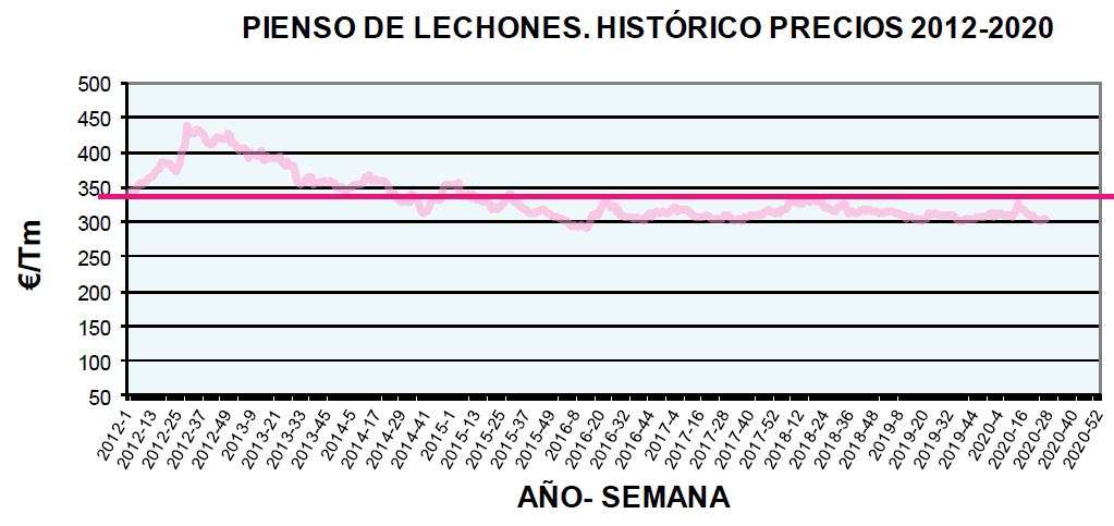 - Precio del pienso lechones: En la semana 26 del ejercicio 2020 presenta un precio de 303,34€/tn, siendo 310,82€/tn la media de lo que corresponde de 2020. La media del periodo 2012-2019 se establece en 333,48€/tn.
