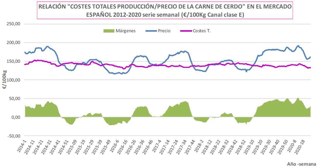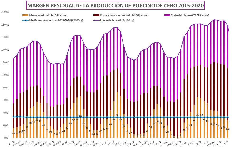 - Margen Residual cebo: Presenta una media para el perido de 2015-2020 de +33,70€/100kg.