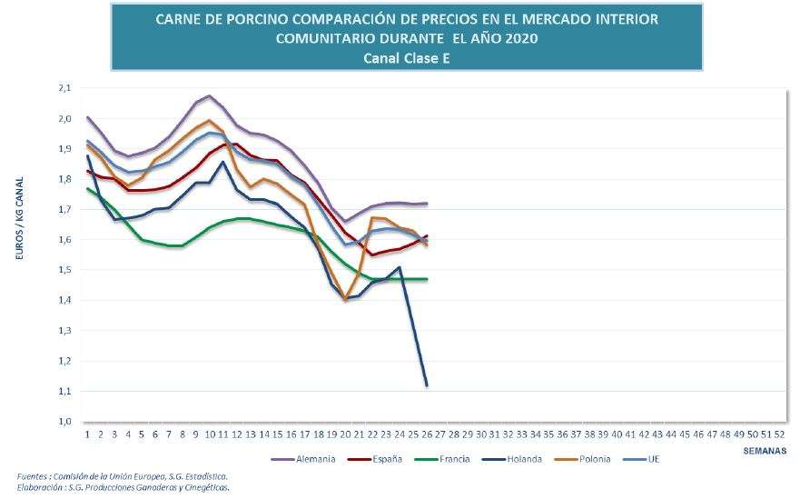 - Precio comunitario de carne de porcino en canal E: Establecido el precio en 159,60€/100kg en la semana 26 de 2020, España presenta un precio superior del +1% respecto a la media de la UE.