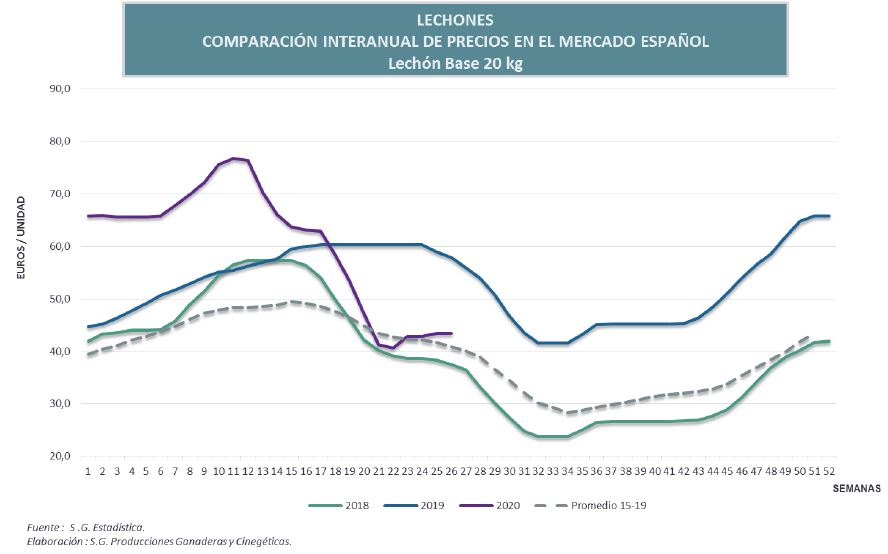 - Precio lechón base 20 kg: Evolución negativa respecto al trimestre anterior del -15,10%, y del -25,03% respecto a la semana 26 del ejercicio de 2019, presentando en la semana 26 del actual ejercicio un precio de 43,43€/lechón.