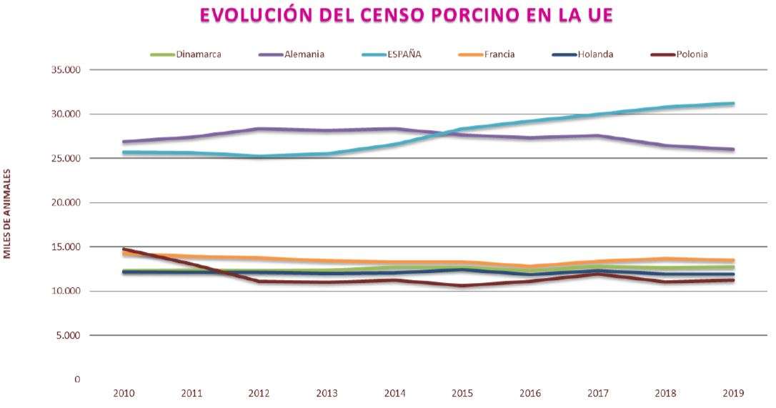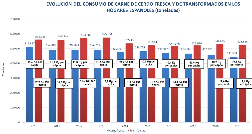 - Consumo de productos frescos y transformados: Establecido una media de consumo de transformados entre los años 2010 y 2019 de 11,10kg/per cápita, y una media de consumo de carne fresca de porcino de 10,10kg/per cápita en el año 2019. La variación entre los periodos 2018 – 2019 presentan una variación negativa de -2,77% en la carne fresca, y en el caso de los transformados una variación de -0,97%.