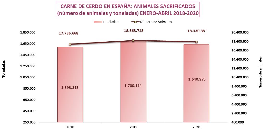 - Producción de carne: Con más de 18 millones de cerdos sacrificados entre enero y abril de 2020, presentan una evolución negativa del -3,47% en toneladas de carne y del -1,25% en número de animales respecto al mismo periodo de 2019.