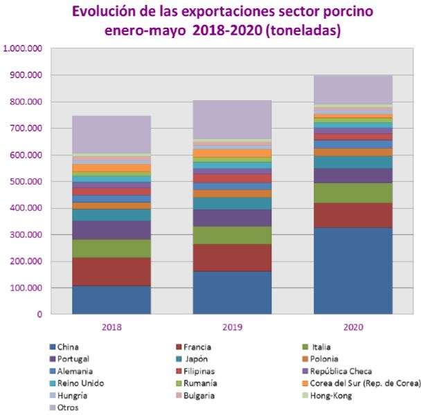 - Destino de las exportaciones: Durante el periodo de enero – mayo de 2018 – 2020, las variaciones positivas de los principales destinos las encabezan China (+102%), Italia (+11,30%), Hungría (+10,20%), Alemania (+10%), Hong Kong (+6,90%), Japón (+4,30%), Polonia (+2,10%) y República Checa (+2,40%). Mientras que con variaciones negativas están Corea del Sur (-53,40%), Filipinas (-22,30%), Bulgaria (-22,20%), Reino Unido (-14,90%), Portugal (-12,10%), Francia (-11,30%), Rumanía (-7,50%), y Otros (-27,30%).