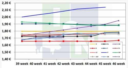 Los precios de mercado alcanzados en Dinamarca en la semana 45 no pueden ignorarse ya que el precio del cerdo danés continuo su trayectoria ascendente. El aumento en 5 céntimos posiciona a Dinamarca líder en la estructura de precios europea de los 5 países miembros de la UE más importantes en la producción porcina. Las cotizaciones belgas y británicas también están subiendo ligeramente.