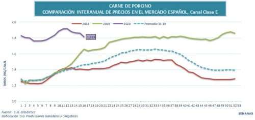 Nueva semana de descensos en los precios de la carne de porcino para la canal E, que bajan de forma un poco más acusada, un 2,5%, que la semana pasada. Sin embargo, y a pesar de los descensos de estas semanas, los precios continúan alcanzando niveles elevados para esta época del año y, sobre todo, dadas las circunstancias actuales. Concretamente, un 9,2% por encima del precio de la misma semana del año anterior y un 23,8% superiores a los precios medios de los 5 últimos años, en esta misma semana. Por su parte, esta disminución del precio se reproduce en el mercado del vivo (-2,25%) mientras que en los principales despieces se mantienen los registros de la semana pasada.