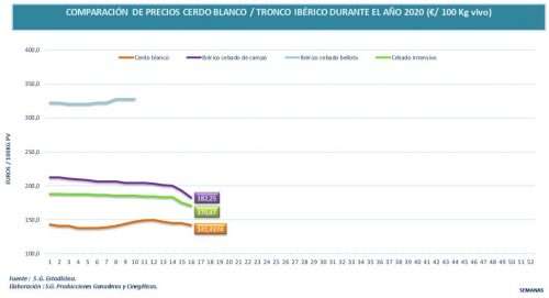 El diferencial de precios entre el cerdo blanco y el ibérico desciende esta semana debido al comentado descenso en el precio del cerdo ibérico en paralelo a la estabilidad de las cotizaciones del cerdo blanco.