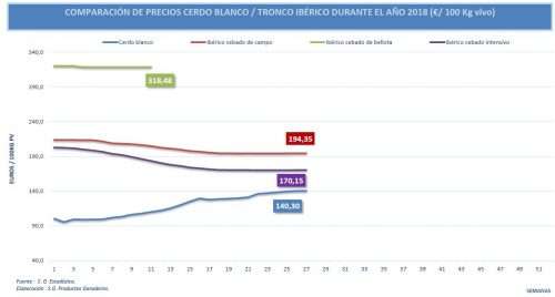 El diferencial de precios entre el cerdo blanco y el ibérico se reduce nuevamente, aunque de forma muy tímida, por el leve incremento del precio del blanco a lo largo de la última semana.