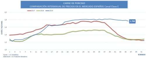 Semana de ligero descenso del precio de la canal E (-1,17%), que sigue manteniendo a un así la estabilidad de los precios de los últimos meses. Las cotizaciones siguen alcanzando niveles muy altos, un 37,6% por encima del precio de la misma semana del año anterior, y acumulan un incremento del 37,3% en lo que llevamos de año. Por su parte, esta estabilidad se reproduce tanto en el precio del vivo como en los principales despieces, que mantienen la misma cotización de la semana pasada y siguen reflejando el equilibrio oferta-demanda que impera en el mercado.