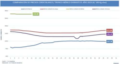 El diferencial de precios entre el cerdo blanco y el ibérico vuelve a ampliarse ligeramente esta semana. Esto se debe a un incremento del precio del ibérico junto al ligero descenso del cerdo blanco. Aun así, esta cifra se mantiene en niveles muy bajos, en comparación con los primeros meses del año, por la tendencia alcista de precios del cerdo blanco y los bajos precios del ibérico de cebo mantenidos a lo largo de todo el año.