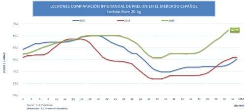 Los precios del lechón se mantienen en tendencia alcista en el mercado español y en la mayor parte de los mercados europeos y en valores muy altos, debido a la ausencia de descenso estacional del cebado por el mantenimiento de una demanda internacional fuerte, fundamentalmente de China.