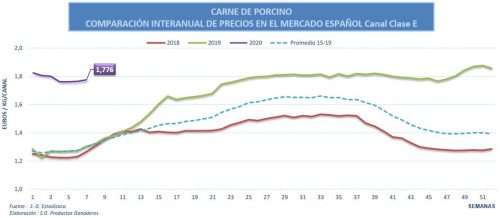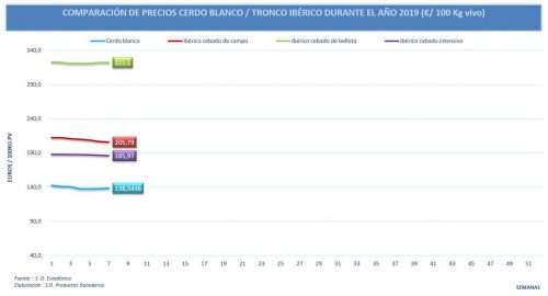 El diferencial de precios entre el cerdo blanco y el ibérico desciende esta semana. Esto se debe a un ligero ascenso en el precio del cerdo blanco en paralelo a los descensos mencionados en las cotizaciones del ibérico. Aún así, esta cifra se mantiene en niveles bajos, en comparación con el inicio de 2019, por la tendencia alcista de precios del cerdo blanco en la segunda mitad del año y los bajos precios del ibérico de cebo mantenidos a lo largo del mismo.