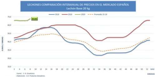 Esta semana, el precio del lechón vuelve a ascender de manera notable (+3%). Las cotizaciones alcanzan casi los 68€/cabeza, cifra récord y más aún en el inicio de un ejercicio. Esta situación alcista de los precios se refleja, también, en las principales lonjas de cotización que suman unos 2 euros al precio de la semana pasada. Dicho registro se sitúa en un 31% por encima del precio de la misma semana del año anterior, empujados por el buen precio del cebado, y un 51,4% por encima de la media de los precios de los últimos 5 años, en esta misma semana.