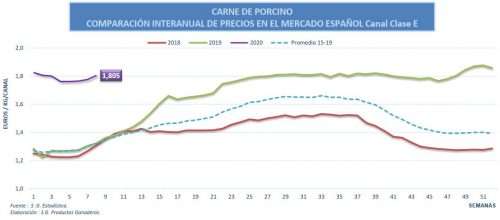 En el ámbito comunitario, el precio medio en la UE asciende, también, esta semana (+2,8%). Esto se debe la estabilidad y los precios al alza en la mayoría de los mercados comunitarios más relevantes. Se mantiene la estabilidad en Holanda y Francia, mientras que se vuelven a registrar ascensos en las cotizaciones de Alemania (+2,8%), España y Polonia (+2,1%). Por tanto, semana de incrementos en los precios de la carne de porcino, tanto en el mercado nacional como en el mercado europeo, con una tendencia a la estabilidad en la mayoría de ellos. Esto se debe a la actual contención de la demanda china así como a la ralentización que el comercio cárnico sufre en los primeros meses del año.