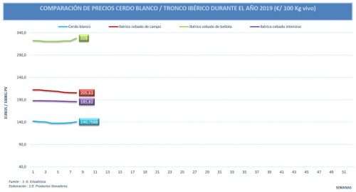 El diferencial de precios entre el cerdo blanco y el ibérico desciende de nuevo esta semana. Esto se debe a un ligero ascenso en el precio del cerdo blanco en paralelo a los descensos mencionados en las cotizaciones del ibérico. Aún así, esta cifra se mantiene en niveles bajos, en comparación con el año pasado, por la tendencia alcista de precios del cerdo blanco en la segunda mitad del año y los bajos precios del ibérico de cebo mantenidos a lo largo del mismo.