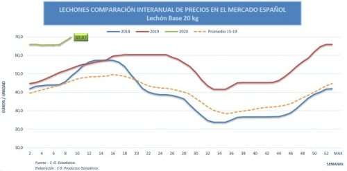 Esta semana, el precio del lechón vuelve a ascender de manera notable (+3%). Las cotizaciones alcanzan casi los 70€/cabeza, cifra récord y más aún en el inicio de un ejercicio. Esta situación alcista de los precios se refleja, también, en las principales lonjas de cotización que suman entre2 y 4 euros al precio de la semana pasada. Dicho registro se sitúa en un 32% por encima del precio de la misma semana del año anterior, empujados por el buen precio del cebado, y un 51,5% por encima de la media de los precios de los últimos 5 años, en esta misma semana.